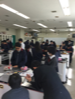 続いて服装ですが、昨年生物室で行った際、生徒さん達は白さ輝く白衣を着ていました。まさに「解剖」するぞといった出で立ち。ところが今回、調理室に現れた姿は、学校指定の紺の体操着(上のみ)に変わっていました。